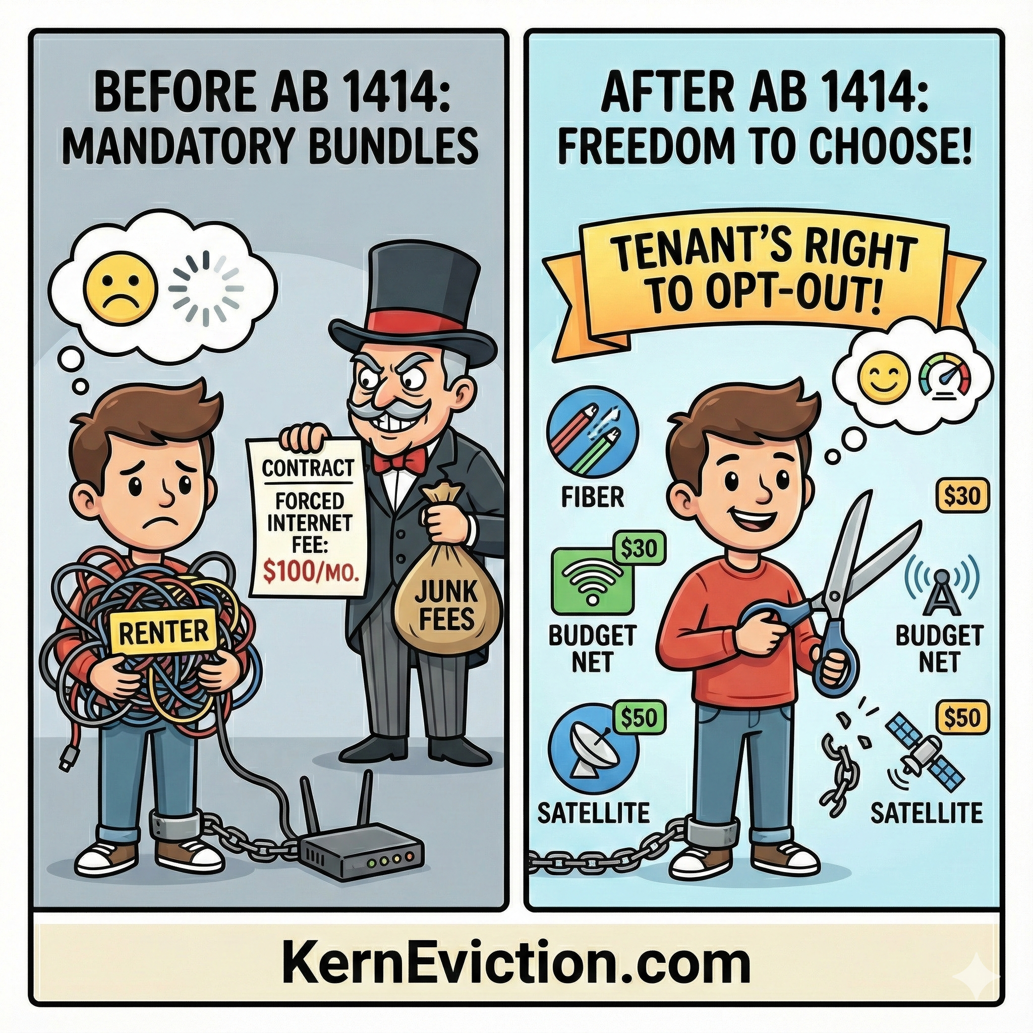 - Choice Mandate: For any tenancy starting or renewing on or after January 1, 2026, landlords must allow tenants to opt out of paying for any subscription from a third-party ISP (wired, cellular, or satellite) offered as part of the lease.
