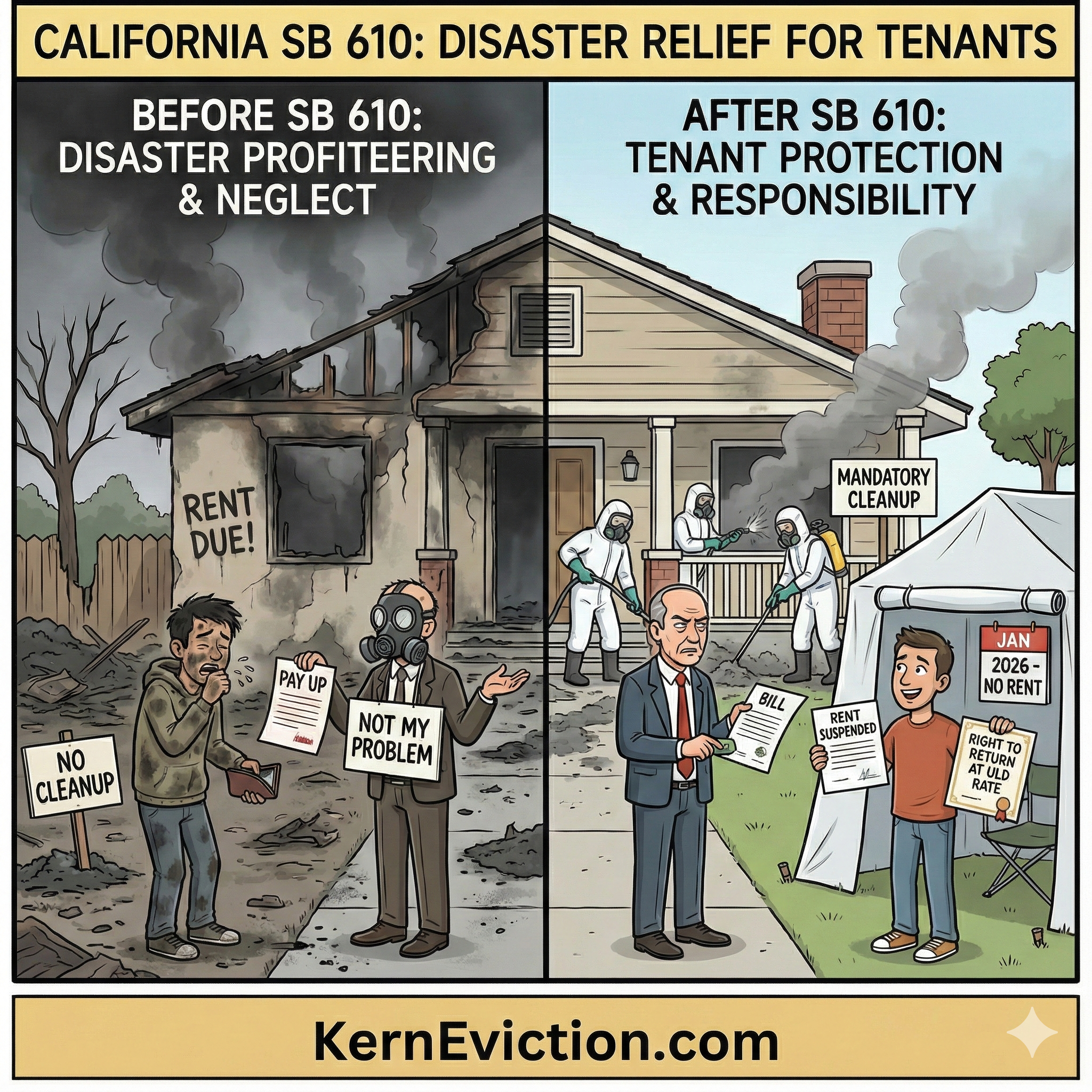 Senate Bill 610 was enacted in response to catastrophic wildfires (such as the Palisades and Eaton fires) to clarify the rights and obligations of landlords and tenants following a declared disaster. It strengthens protections for those displaced by natural disasters and ensures hazardous cleanup is a landlord responsibility.